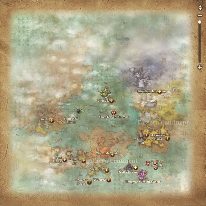 The world of Blade and Soul, is a vast extension of land containing two continents (the Southern Continent and the Eastern Continent) with four major zones: Viridian Coast, The Cinderlands, Moonwater Plains and Silverfrost Mountains. Each Zone is further divided into numerous Regions, and each Region contains multiple locations and dungeons. A dungeon is usually accompanied with a Dragonspire. Locations may be Villages, Mills, Posts, Camps, Tradeposts and so on, and will usually have its own Windstride.